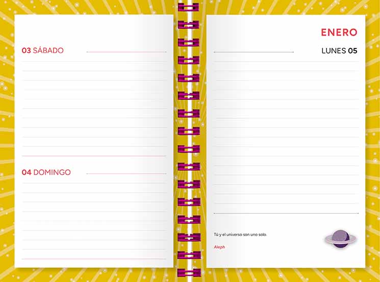 FICHA TÉCNICA Páginas: Un día por página - 368 páginas páginas Formato: Formato: 13,5 x 20 cm Tipo de tapa: Tapa con laca sectorizada y stamping/ Cierre con banda elástica / Tapa con laca sectorizada y stampi