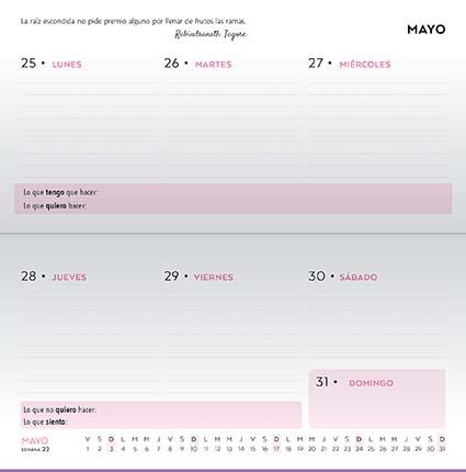 FICHA TÉCNICA Páginas: Semana a la vista- 144 páginas / Incluye cinta mar páginas Formato: 17 x 9 cm Tipo de tapa: Encuadernación: cartoné/ Laca en las líneas /Tapa con laca sectorizada