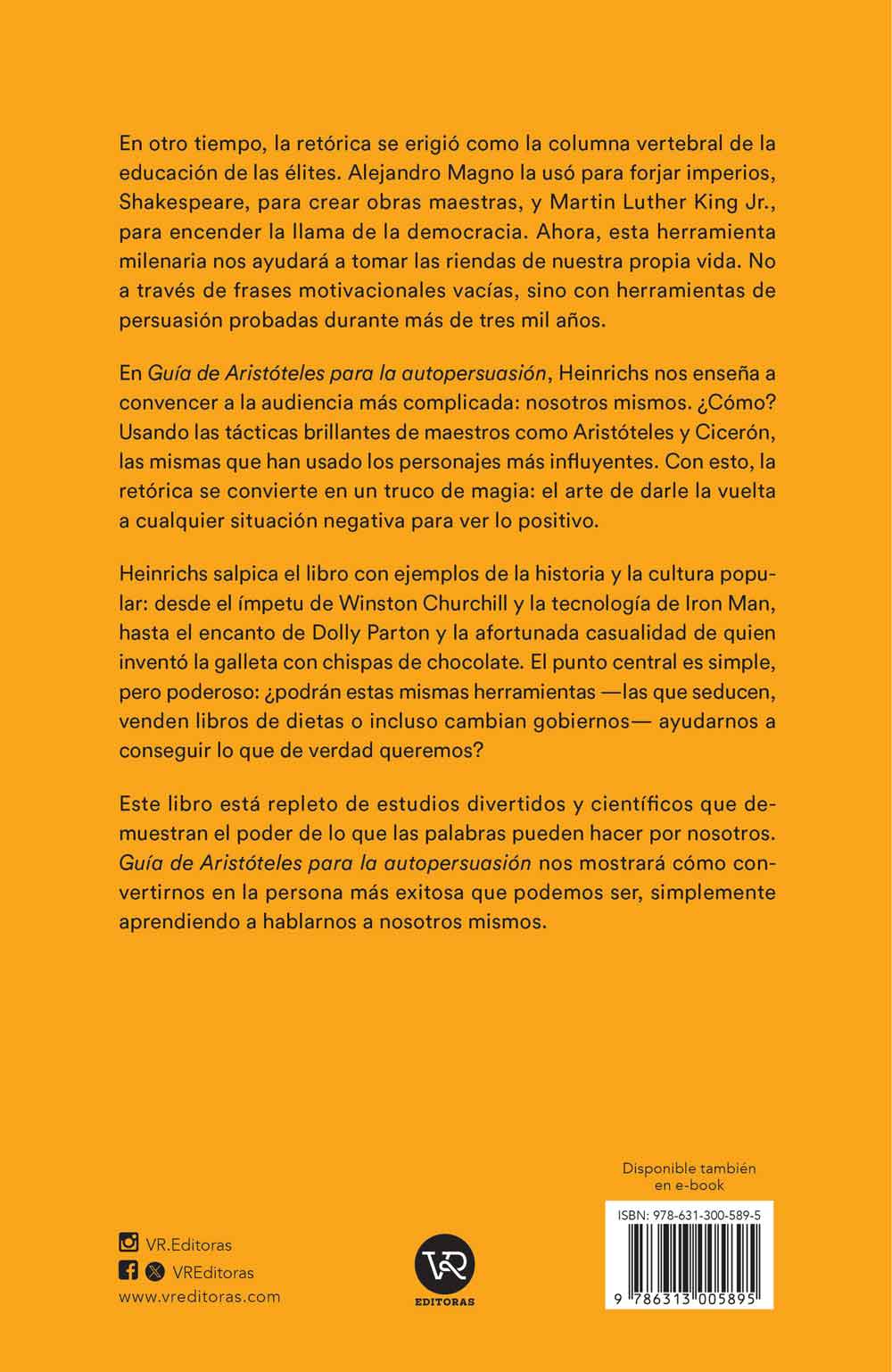 En otro tiempo, la retórica se erigió como la columna vertebral de la educación de las élites. Alejandro Magno la usó para forjar imperios, Shakespeare, para crear obras maestras, y Martin Luther King Jr., para encender la llama de la democracia. Ahora, esta herramienta milenaria nos ayudará a tomar las riendas de nuestra propia vida. No a través de frases motivacionales vacías, sino con herramientas de persuasión probadas durante más de tres mil años. En Guía de Aristóteles para la autopersuasión, Heinrichs nos enseña a convencer a la audiencia más complicada: nosotros mismos. ¿Cómo? Usando las tácticas brillantes de maestros como Aristóteles y Cicerón, las mismas que han usado los personajes más influyentes. Con esto, la retórica se convierte en un truco de magia: el arte de darle la vuelta a cualquier situación negativa para ver lo positivo. Heinrichs salpica el libro con ejemplos de la historia y la cultura popular: desde el ímpetu de Winston Churchill y la tecnología de Iron Man, hasta el encanto de Dolly Parton y la afortunada casualidad de quien inventó la galleta con chispas de chocolate. El punto central es simple, pero poderoso: ¿Podrán estas mismas herramientas —las que seducen, venden libros de dietas o incluso cambian gobiernos— ayudarnos a conseguir lo que de verdad queremos? Este libro está repleto de estudios divertidos y científicos que demuestran el poder de lo que las palabras pueden hacer por nosotros. Guía de Aristóteles para la autopersuasión nos mostrará cómo convertirnos en la persona más exitosa que podemos ser, simplemente aprendiendo a hablarnos a nosotros mismos.